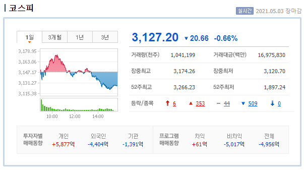 공매도 영향 때문인지 5월 3일 증권시장은 대부분 약세를 보였고, 개인이 5,877억 원 순매수한데 반해 외국인은 4,404억 원 매도, 기관 역시 1,391억 원을 매도하였습니다. 아직 1일차이긴 하지만 공매도 부활에 따른 주가 하락은 크지 않아 보입니다. 많은 분들이 염려하던 큰 하락은 없을 테니 안심하셔도 될 듯합니다.
