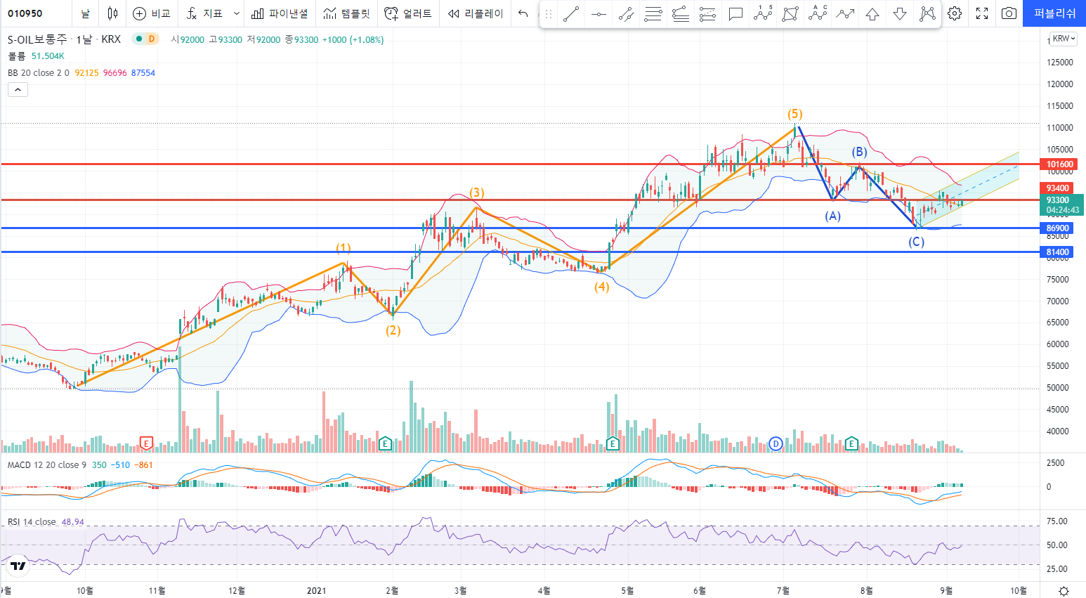 에스오일은 작년 3월 크게 하락한 뒤 바로 상승 추세를 타지 못하고 주가가 크게 하락했습니다. 경기침체로 오일 수요가 극감 하다 보니 그대로 타격을 입었기 때문인데요. 현재는 고유가에 맞게 수익구조가 개선되면서 크게 상승한 모습입니다. 엘리엇 파동 관점에서 보면 상승 5파와 하락 3파까지 완료된 상황이고, 새롭게 상승 5파를 이어갈지 아니면 박스권에서 바닥을 다질지 지켜봐야 하는 단계입니다. 하락 3파 이후 상승 추세로 전환했는데 현재 저항선인 93,000원 대를 넘어서면 추가적인 상승도 기대할 수 있습니다. 거래 물량은 크게 감소한 모습이지만 매수성향이 강해지고 있기 때문에 향후 주가 방향은 긍정적일 거라 기대합니다.