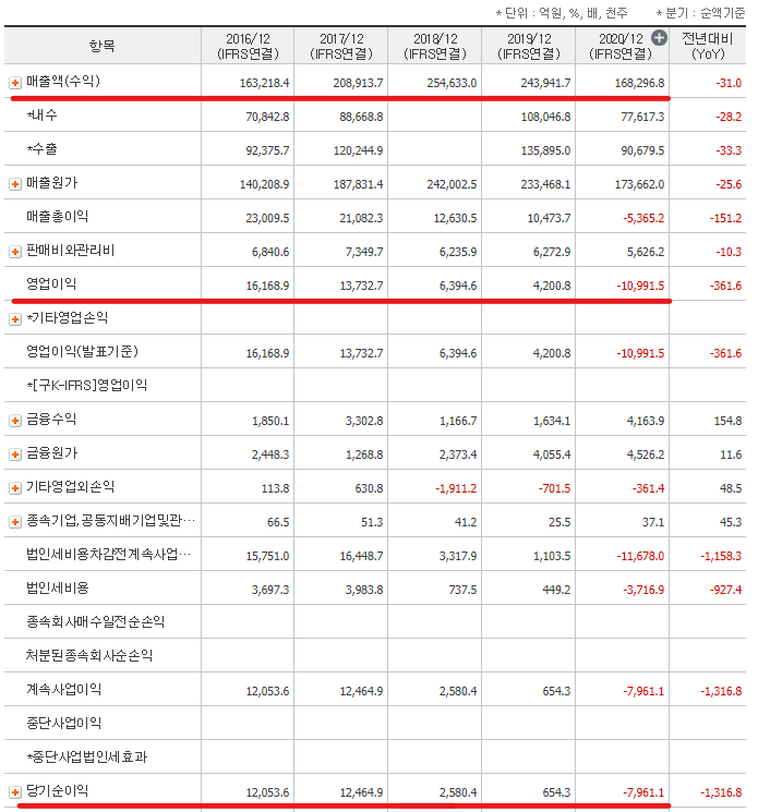 매출액은 그럭저럭 괜찮은 성과를 보였었는데 영업이익과 당기순이익이 2018년을 기점으로 큰 폭으로 하락했습니다. 2020년은 코로나 영향으로 매출액, 영업이익, 당기순이익 모두 급감했네요. 작년은 코로나라는 특수한 영향이 있었기 때문에 이해하고 넘갈 수 있으나 2018년과 2019년 실적은 분명히 짚고 넘어갈 필요가 있습니다.