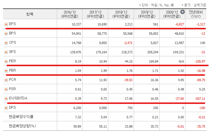 당기순이익이 마이너스로 전환되면서 EPS 역시 마이너스로 전환되었습니다. 2018년부터 주당순이익이 급격히 감소하는 것을 확인할 수 있네요. PER은 EPS와 격차만큼 큰 폭으로 증가하였습니다. 해당 부분만 보면 상당히 고평가 된 종목입니다. 반면 PBR을 오히려 감소하는 모습을 보여주면서 저평가되었음을 나타냅니다. 이런 경우 설비 증가나 토지/공장 매입으로 자산이 늘었을 가능성과 주가가 크게 감소했을 경우로 예상할 수 있는데 에쓰오일의 경우 후자입니다. 때문에 PBR을 투자지표로 삼기에는 위험이 상당히 큰 편입니다. EV/EBITDA 역시 큰 폭으로 상승 후 마이너스로 전환했기 때문에 투자 매력도는 많이 떨어집니다.