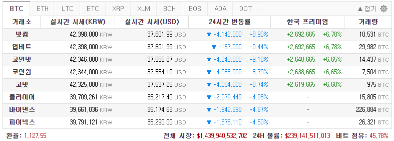 지난 4월 큰 폭으로 하락할 때 주저하지 않고 추매를 했던 이유는 20% 가까이 끼어있던 김치 프리미엄이 소멸했었기 때문입니다. 그러나 현재는 여전히 7% 가까이 김프가 끼어있는 상황이라 앞으로 최소 7%정도는 추가적으로 하락할 수 있지 않을까 싶습니다.