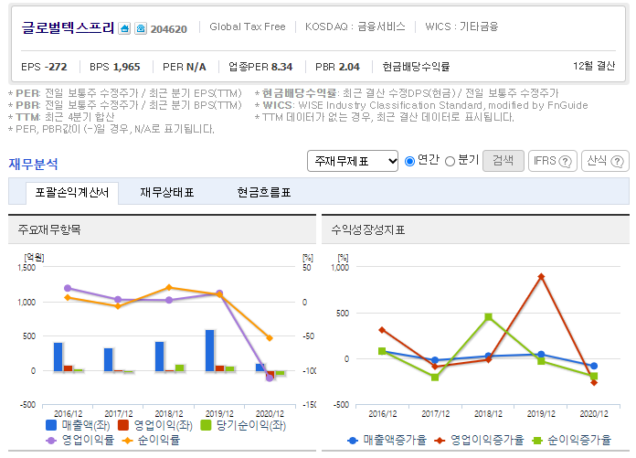 글로벌텍스프리는 코스닥 556위로 시가총액이 1,959억밖에 되지 않은 소기업입니다. 일반적으로 저는 이렇게 시총이 낮고 낮고 재무안정성이 불안한 종목은 투자에 고려하지 않지만 재미 삼아 볼만할 것 같아서 넣어 보았습니다.