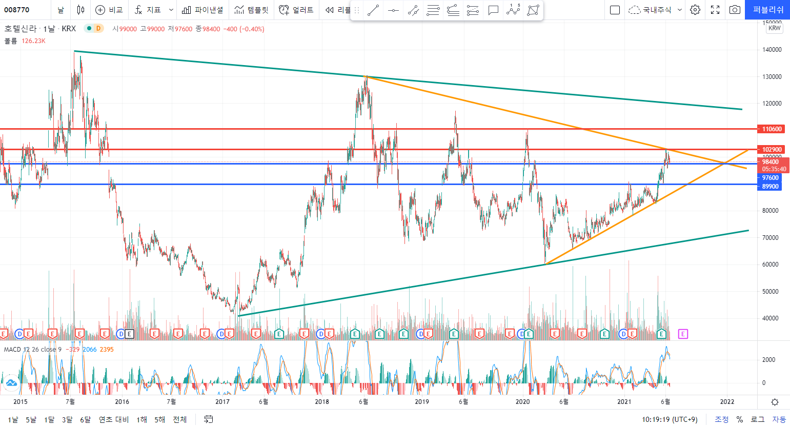 차트를 보면 2015년 이후 고점과 고점을 낮추면서 저점과 저점을 높이는 전형적인 쐐기형 모습을 보이고 있습니다. 10만 3천 원 부근 저항선과 9,800원 부근의 지지선에서 멈춰있는 상황입니다. 개인적으로는 백신 보급 확대와 트래블 버블 및 각국의 입국 완화 정책, 수익성 개선(적자폭 축소)과 쐐기형 패턴에 의해 저항선을 뚫고 11만 원 까지는 무난하게 오르지 않을까 예상합니다. 추가적인 호재가 있다면 12만 원 선까지 상승도 가능할 것 같습니다. 다만 현재 가격에서 빠진다면 9만 원 선까지 하락할 수 있는데, 그 후에는 상승으로 다시 전환할 것으로 보여 10만 원 회복은 무난해 보입니다.