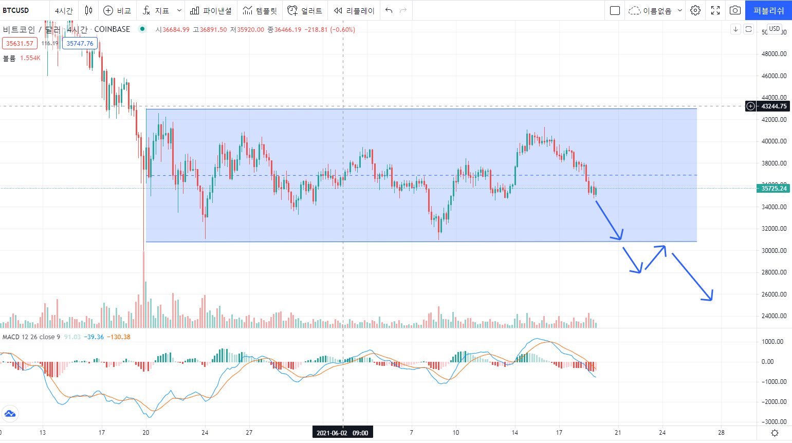 현재 비트코인은 3만 ~ 4만 불 사이에서 박스권을 형성하고 있습니다. 하방 추세에서 박스권을 형성했기 때문에 박스권 하단을 세 번 터치한 후 하방으로 추가 하락할 가능성이 높아 보입니다. 거래량이 많이 감소한 상태이며 MACD지표에서도 하방압력을 강하게 받는 모습입니다. 3만 4천 불 부근의 지지선이 깨진다면 3만 불까지 빠질 가능성이 높고 그렇게 된다면 박스권을 이탈하며 하락하는 패턴을 만들 가능성이 큽니다. 코인 시장에서 차트 분석은 의미가 없다고는 하나 0.1%라도 가능성을 찾기 위해서라면 무엇이든 시도해야 할 때라고 생각합니다.