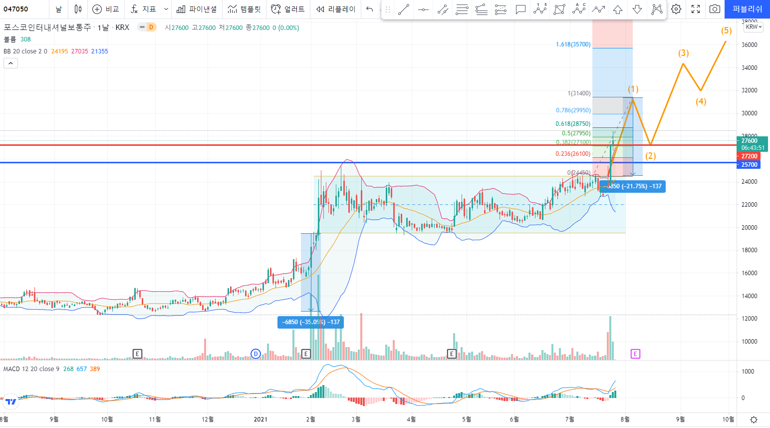 2020년 2월부터 장기간 박스권에서 횡보하던 포스코인터내셔널은 2분기 실적 발표와 함께 박스권을 뚫고 상승하고 있습니다. 워낙 장기간 박스권에서 주가를 다졌고 현재 물량이 상당히 터진 상황이기 때문에 새로운 엘리엇 파동이 진행되지 않을까 기대됩니다. 박스권 직전 상승구간을 기준으로 향후 주가 추이를 예상해보면 대략 32,000원 부근까지 1 파동이 진행되지 않을까 싶습니다. 만약 주가가 하락한다고 해도 26,000원에서 24,000원 부근에서는 안정적으로 지지할 것으로 예상됩니다.