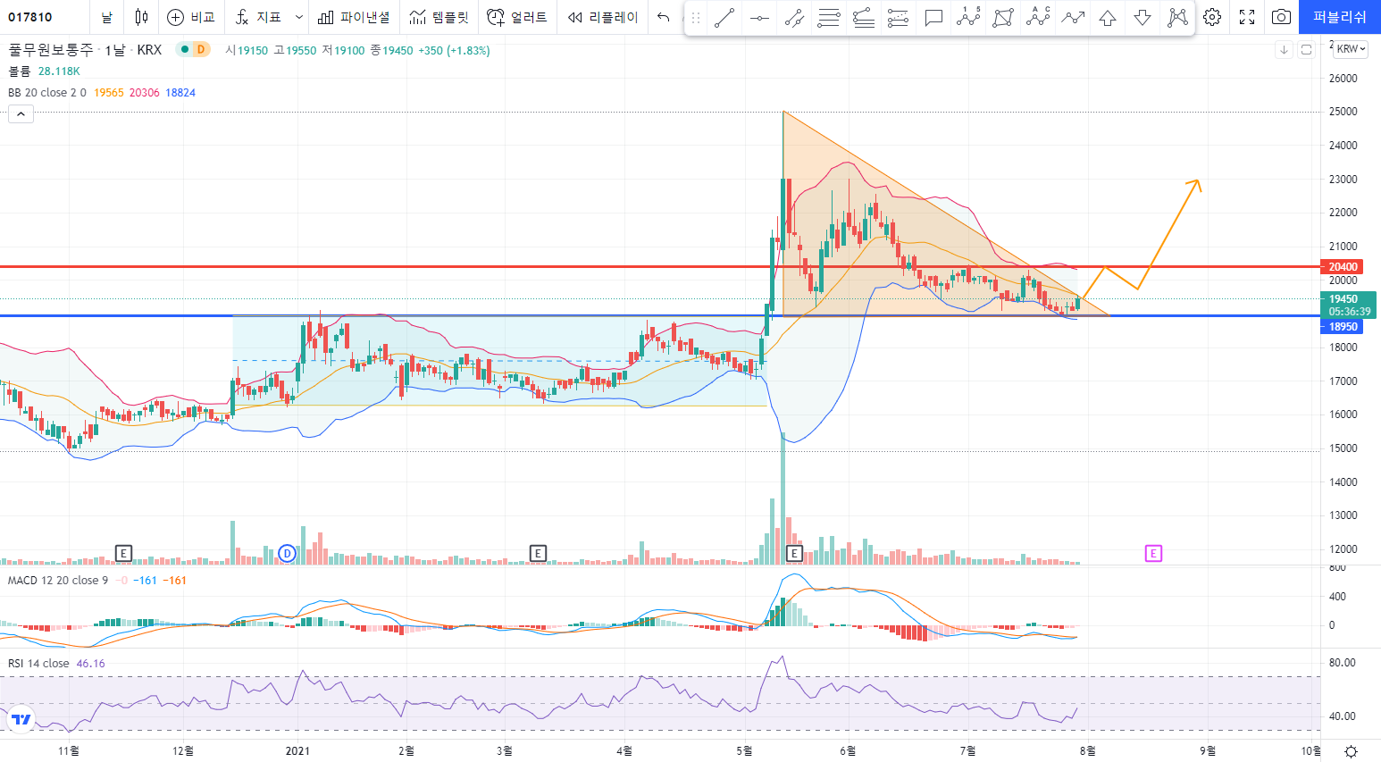 작년 12월부터 올해 4월까지 상당기간 박스권에서 바닥을 다졌고, 지난 5월 가파르게 상승하며 최고점을 찍은 후 장기간 하락세를 보이는 트라이앵글 패턴입니다. 트라이앵글 패턴의 끝부분에 다다랐기 때문에 어느 한쪽으로든 방향이 결정될 것 같은데, 개인적으로는 상승세로 전환할 거라 기대합니다. 첫 번째 이유는 장기간 박스권에서 바닥을 다지고 올라갔다는 점이고, 상승추세에서 발생한 트라이앵글 패턴이기 때문에 추가적으로 상승할 여력이 높다고 판단됩니다. 두 번째는 보조지표로 사용하고 있는 MACD, 볼린저밴드, RSI 모두 상승으로 전환할 거란 시그널을 보이고 있기 때문입니다.