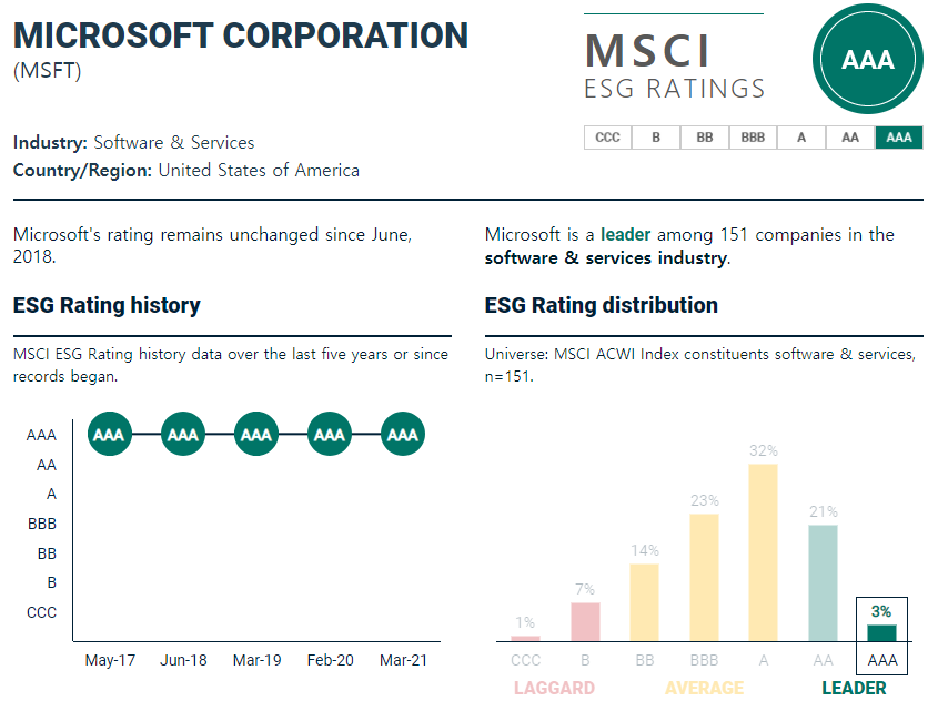 마이크로소프트는 ESG경영 역시 선도해나가고 있는 기업입니다. 창립자인 빌 게이츠의 경우, 이미 환경에 대한 중요성을 여러 번 언급하였고 실제로 친환경 에너지 및 상품 개발, 바이오산업, 사회공헌 활동에 집중하는 모습을 보여주고 있습니다. 그 덕분인지 MSCI에서 평가에서 지난 5년간 꾸준히 AAA등급을 획득하며 ESG경영에 있어서 독보적인 기업임을 다시 한번 증명하고 있습니다. 시가총액 1위인 애플의 경우 A를 유지해 오다가 2020년 BBB로 떨어진 것을 감안하면 분명 대단한 실적임이 틀림없습니다. 큰 이변이 없는 한 마이크로소프트의 ESG 경영 평가는 최상위권에 속할 것으로 예상되며 시총이 높은데 비해 ESG 등급이 낮은 기업들은 분명 마이크로소프트를 밴치 마킹하거나 따라가기 위한 노력(돈 * 시간)을 기울일 것으로 예상됩니다. 격차가 벌어진 만큼 마이크로소프트는 안정적으로 성장해 나 기지 않을까요?