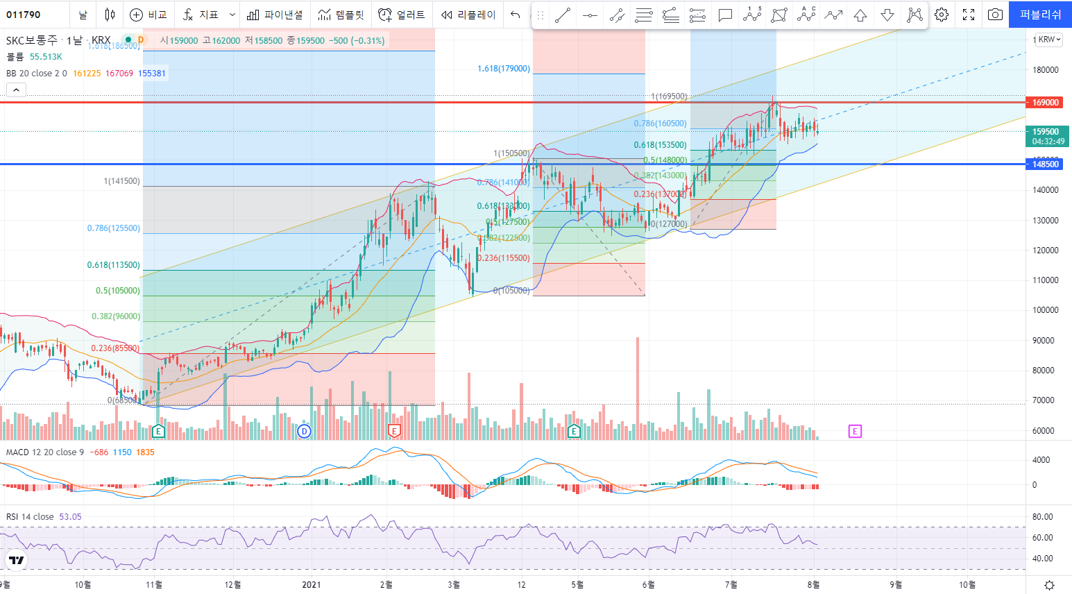 작년 11월 ~ 올해 2월까지 상승 후 조정, 3월 ~ 4월 상승 후 조정을 반복하고 있는데, 과거 피보나치 되돌림 비율을 보면 50%선에서 반등을 주고 있습니다. 같은 맥락에서 현재 고점을 기준으로 보면 148,000원 부근까지 조정을 받은 후 재상승할 것으로 예상됩니다. 현재 지점에서 강하게 지지하고 있기 때문에 반등이 올 가능성도 있기 때문에 매수를 고려한다면 지금부터 분할로 진입해도 괜찮을 것 같습니다.