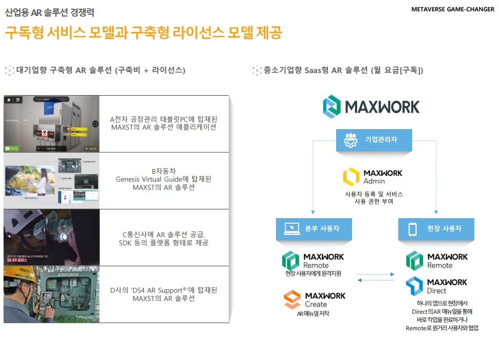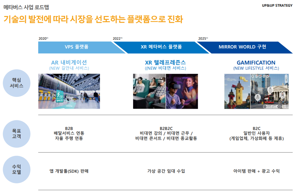 공간기반 AR 플랫폼, 산업용 AR 솔루션, AR 디바이스 설루션 역시 수익구조 모델을 갖춰가고 있습니다. AR분야에서는 선도하고 있는 기업으로 플랫폼을 통해 이용자를 모으고 이를 기반으로 AR설루션, 디바이스 제품 판매하는 구조 외에 지속적으로 서비스를 구독하게끔 유도하는 구조가 성공적이라는 사실을 카카오나 MS, 애플 등을 통해 우리는 이미 알고 있습니다. 때문에 관련 산업분야에 AR 서비스 구축 및 구독으로 안정적인 수익을 얻겠다는 계획은 상당히 긍정적이라 생각합니다.