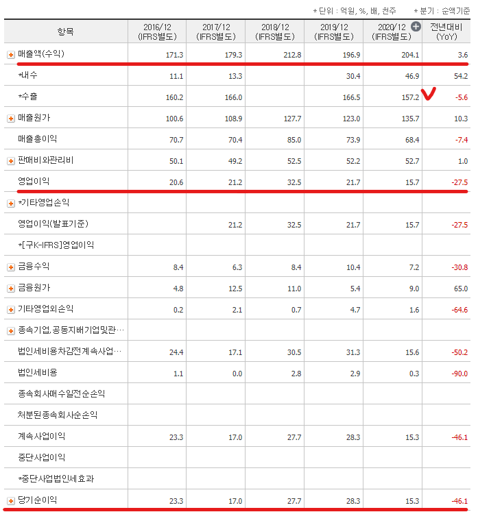 2020년 영업이익이 고스란히 당기순이익으로 연결된 것은 상당히 긍정적입니다. 원가 외 항목은 관리가 잘 되고 있는 것이기 때문에 원가절감만 가능하다면 곧바로 수익 개선으로 이어지기 때문입니다. 올해 매출액 성장이 얼마나 되는지 지켜보고 싶은 종목입니다.