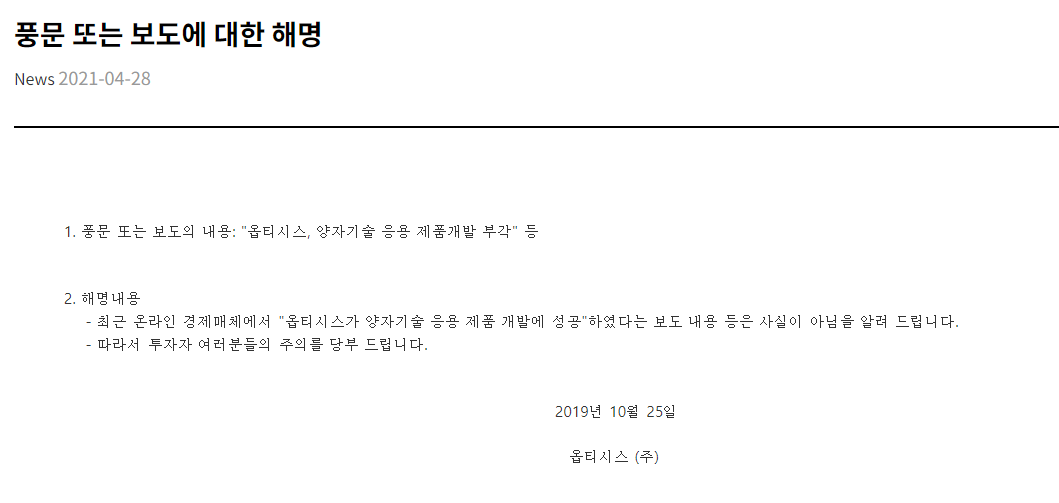 옵티시스는 한 때 '양자기술 응용 제품 개발' 등과 같은 풍문에 휩싸이기도 했습니다(구글과 인텔이 해내지 못한 것을 옵티시스가?!!!). 양자기술을 탑재한다면 메타버스 플랫폼 연결 역시 손쉬운 상황이겠지만 사실이 아님을 공시하였습니다. 2년 전에 이미 해명한 사실에도 최근 메타버스 관련주로 떠오르면서 다시 양자기술 응용 제품 개발 풍문이 다시 전파되었고, 지난 4월 해명하는 글을 게시하기도 했습니다. 주의해야 할 점은 회사 홈페이지만 접속해도 이 말이 사실인지 아닌지 쉽게 알 수 있으나 많은 분들이 정확한 사실 확인 전에 성급하게 매수를 하는 실수를 범하는 점입니다. 우리나라 중소기업이 이런 대업을 이룬다면 정말 반가운 소식이겠지만 현실적으로 어려운 게 사실이기에 정확한 내용을 확인하기 바라며, 풍문에 따라 매매하는 습관은 버리는 걸 권해드립니다.