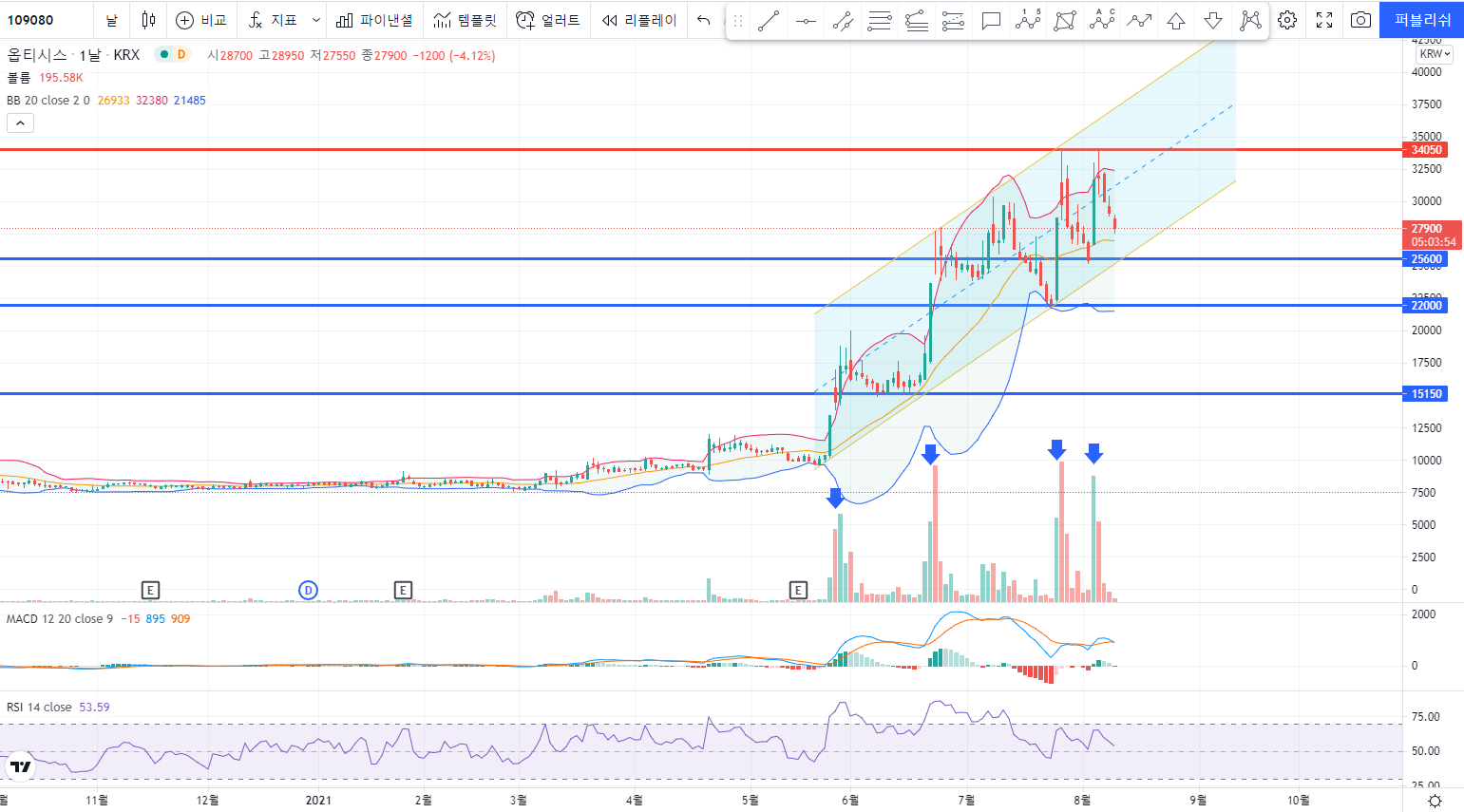 이에 따라 한국거래소에서는 투자경고종목으로 지정하기도 했습니다. 그럼에도 거래량이 한 번씩 터지면서 불과 4개월 사이에 주가는 4배가량 상승했습니다. 현재는 최고점인 34,000원을 찍고 17%가량 빠진 28,000원 선에서 거래되고 있습니다. 메타버스 관련주로 묶였는데 아직까지 뚜렷한 성과는 없기 때문에 지나친 관심과 투기성향으로 상승한 종목이라는 생각이 듭니다.